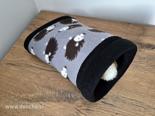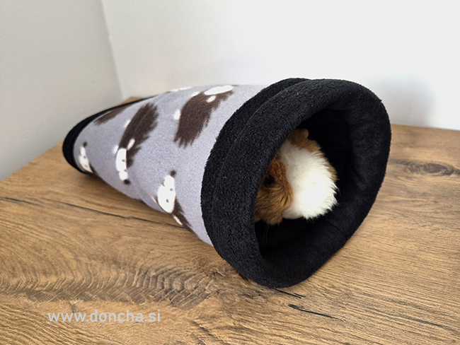 Izdelan je iz mehkega flisa. Diskretno všiti skriti šivi zagotavljajo lep videz in dolgo obstojnost, všiti PVC trak pa omogoča hitro in enostavno namestitev. Ta tunel ima PVC trak samo na eni strani, tako ima živalca vseeno malo zasebnosti, pravtako pa se ne počuti ujeta v tunelu.